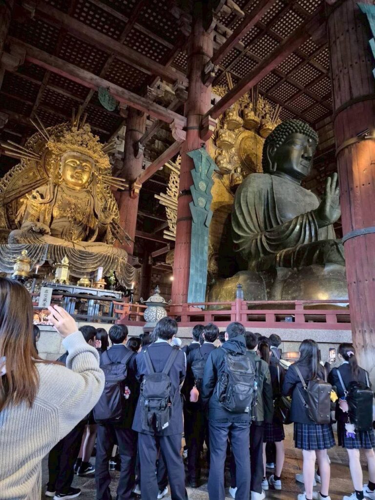 ต่อมา คณะได้มุ่งหน้าสู่เมืองนารา อดีตเมืองหลวงเก่าของญี่ปุ่น เพื่อศึกษาเรียนรู้เกี่ยวกับ อนุสรณ์ประวัติศาสตร์โบราณสถาน เมืองนารา (Historic Monuments of Ancient Nara) ซึ่งได้รับการขึ้นทะเบียนเป็นมรดกโลกโดยยูเนสโก ไฮไลท์ของการศึกษาเรียนรู้ คือการเยี่ยมชม วัดโทไดจิ (Tōdai-ji Temple) คณะฯ ได้เข้าสักการะ พระพุทธรูปไดบุตสึ (Daibutsu) ที่ประดิษฐานอยู่ในวิหาร ไดบุตสึเด็น (Daibutsuden) ซึ่งเป็นอาคารไม้ที่ใหญ่ที่สุดในโลก นับเป็นโอกาสในการศึกษาความยิ่งใหญ่ของสถาปัตยกรรมไม้โบราณ และทำความเข้าใจรากฐานของพระพุทธศาสนาในยุคนารา ซึ่งเป็นช่วงเวลาสำคัญของการก่อร่างสร้างอารยธรรมญี่ปุ่น